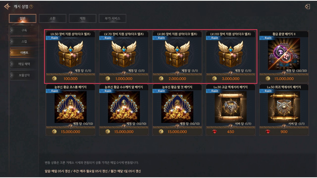 | LV.110 ์ฅ๋น ์ง์ ์์(๋คํฌ ์ํ) | 3,000,000 ํฌ๋ก | ๊ณ ๊ธ ์ฃผ์ ์ฌ ๋ชจ์ | 1 | ๋ ๋ฒจ 90 ์ด์, ๊ณ์ ๋น 1ํ |