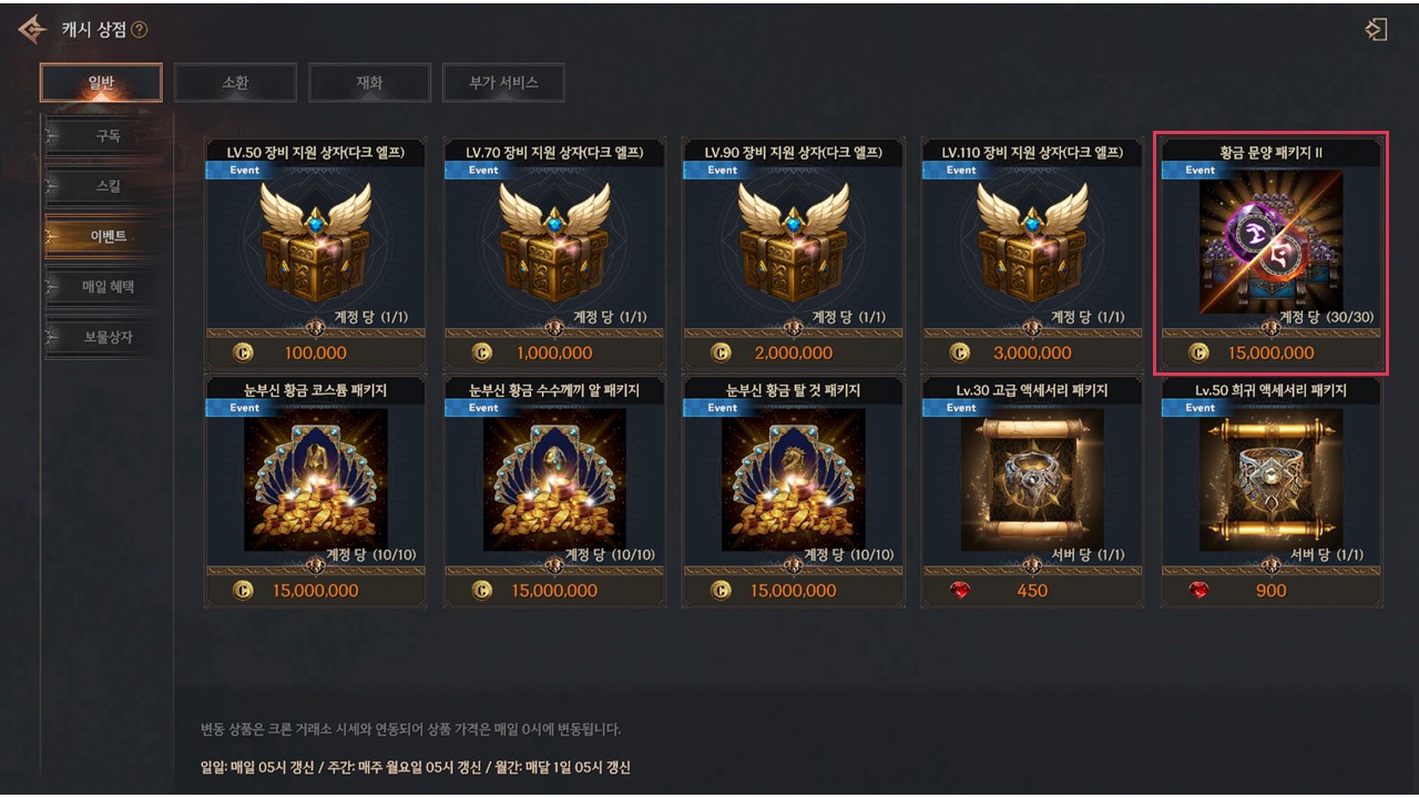 | 황금 문양 패키지 II | 혼돈의 문양강화석 상자 | 50 | 1500만 크론 | 계정당 30회 |