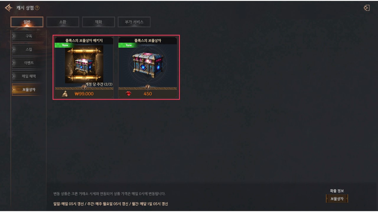 | 플록스의 보물상자 패키지 | 플록스의 보물 상자 | 25 | ₩99,000 | 계정당 주간 2회 |